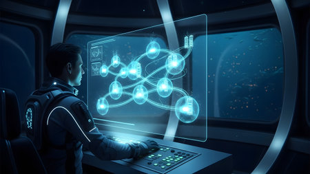 Underwater showing man in futuristic suit operates a digital interface displaying an underwater...