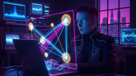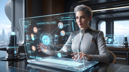 A woman works on a laptop with a holographic screen showing interconnected digital heads and...