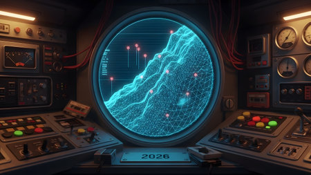 Radar showing submarine bridge with a large radar screen showing a wireframe map with red...
