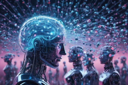 Futuristic AI Robots with Illuminated Digital Brains. Generative AI.