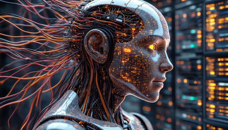 A close-up view of a futuristic robotic head demonstrating complex circuitry and glowing features.