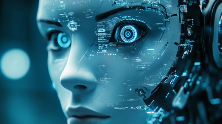 Close-up of futuristic robot face. Technology and artificial intelligence concept
