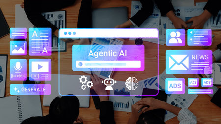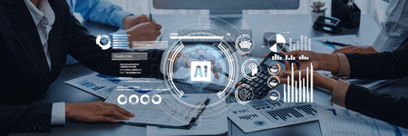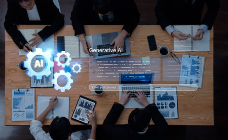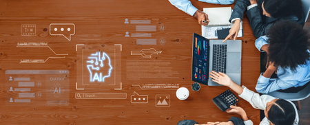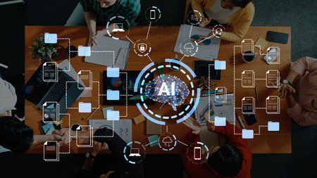 Collaborative Work Environment with AI Technology Concepts and Digital Connectivity in a Modern Office Setting.