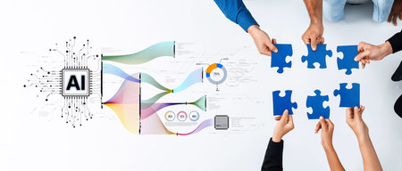 A dynamic teamwork scene featuring hands assembling blue puzzle pieces, emphasizing collaboration and AI-driven solutions for innovative project strategy.