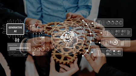A group of hands collaborates over gears illustrating the fusion of artificial intelligence and technology, emphasizing teamwork and innovation in today business landscape. Raster