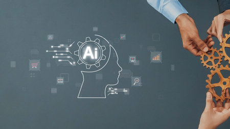 Hands working together to assemble gears with an overlay of AI graphics represent collaboration and innovation in technology and business development. Raster