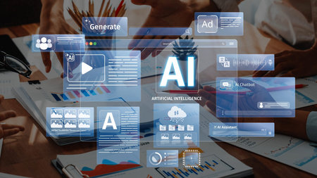 This image captures a modern digital interface focusing on artificial intelligence concepts, showcasing tools for business development and marketing strategies. Raster