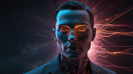 3d rendering of male cyborg face with glowing particles on dark background