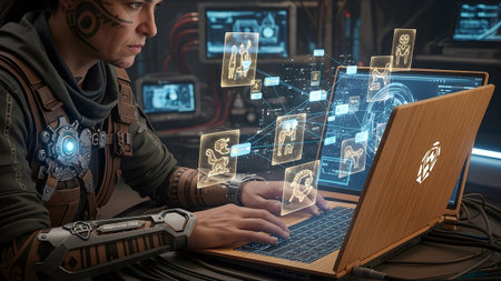 A person with face and arm markings uses a wooden laptop displaying glowing holographic...