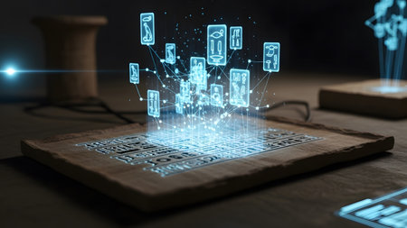 Scroll showing ancient egyptian papyrus scroll with glowing hieroglyphs and holographic...