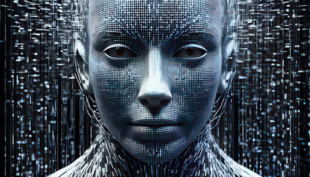 Cyborg face with binary code. Artificial intelligence concept. 3D Rendering
