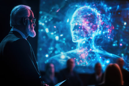 An elderly researcher discusses advancements in artificial intelligence while engaging an attentive audience.