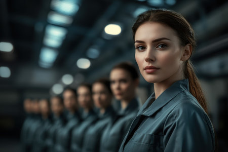 A group of women dressed in uniforms poses in a factory, showing teamwork and professionalism.