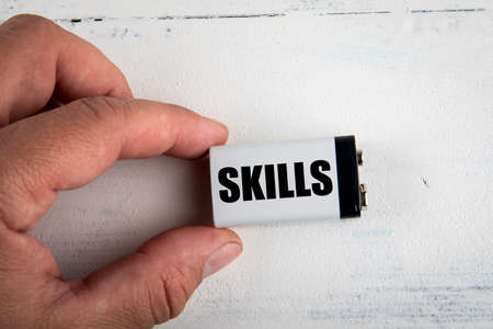 SKILLS concept. White battery in a mans hand on a painted wooden background