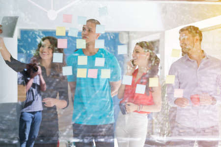 business, startup, planning, management and people concept - happy creative team writing on stickers at office glass board
