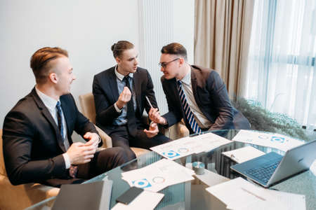 Team of businessmen work together in office. Concept of teamwork and partnership