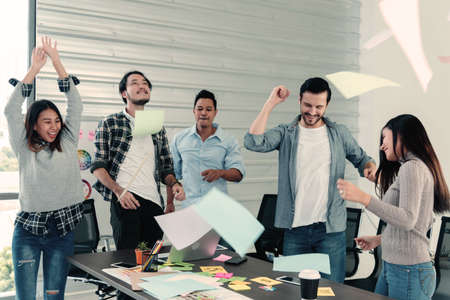 Group of business people finish job done throwing paper work and dance with happiness. Diversity people dance, fun, joy, happy promotion employment having good news. Man look at camera dancing happy