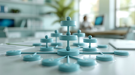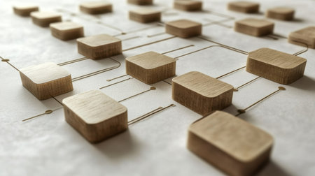 This image features an abstract arrangement of wooden blocks on a minimalist surface, symbolizing connection and structure in modern design aesthetics.