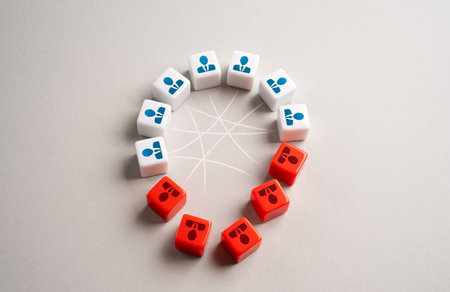 Central red figure of employee disrupts the system. Toxic incompetent employee. Unsuitability for work, inappropriate for teamwork. Conflict with colleagues. Difficulties of adaptation in new society.