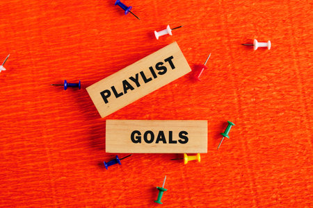 Two wooden blocks with the words playlist and goals are set against a bright orange surface, surrounded by colorful push pins, symbolizing organization and creativity in music selection.