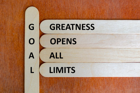 Wooden stick acronym GOAL encouraging ambition, vision, courage, and determination to achieve limitless growth and excellence.
