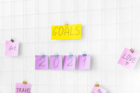 felt board with text - 2021 goals isolated on yellow background Planning, self motivation, achievement, success, wish list, checklist concept Top view Flat lay Motivational quote, message.