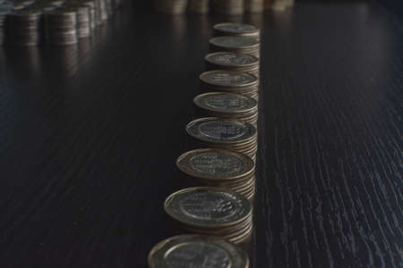 Savings, increasing columns of coins, piles of coins arranged as a graph in dark room, business banking concept idea
