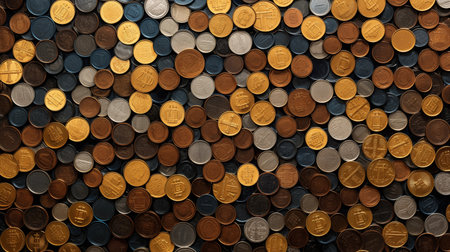 A Coins scattered on dark surface, showcasing various denominations and textures, creating interesting visual pattern. arrangement highlights metallic shine and details of each coin