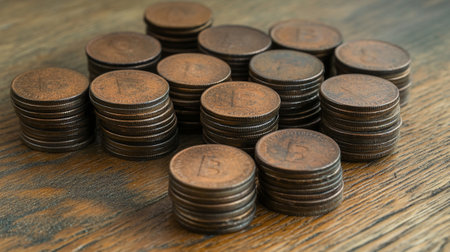 A stack of various coins sits neatly arranged on a wooden table, reflecting light and creating a sense of wealth and stability.