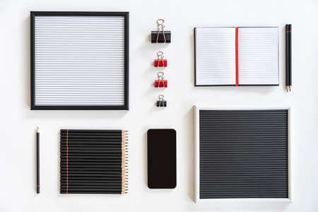 Black and white business or school accessories, organized on table in knolling arrangement. Business knolling, home office flat lay on white background