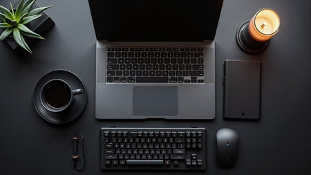 An organized workspace showcases a laptop, smartphone, and headphones. Additional elements include a planner, pen, coffee cup, and a small potted plant. The setting appears bright and modern with neutral colors. Suitable for illustrating technology, business, or lifestyle themes.