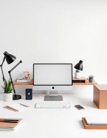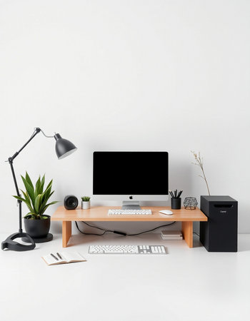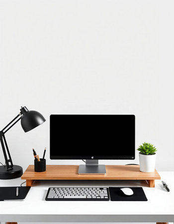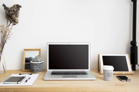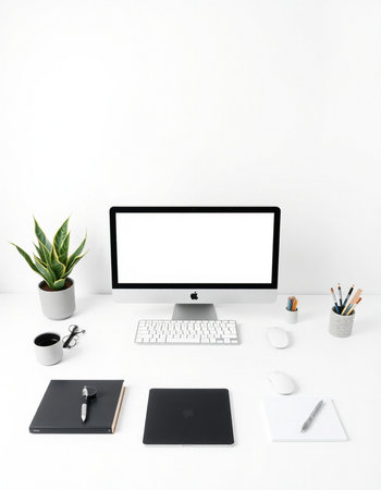 Minimal workspace with blank computer screen, stationery and copy space on white wall background