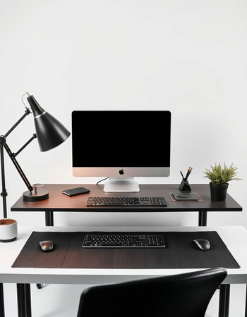Office desk arrangement office background, top view, 45 degree, high adjustable table, with monitor , tools and devices setup.