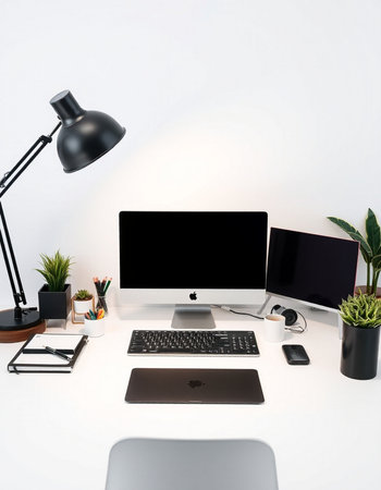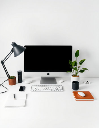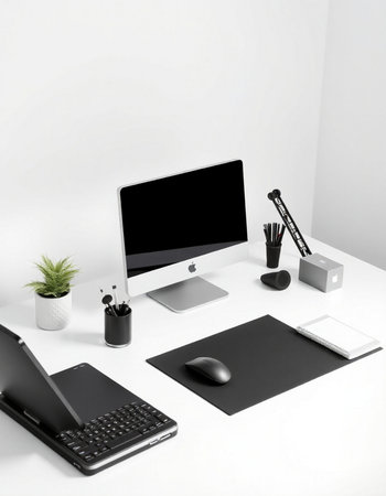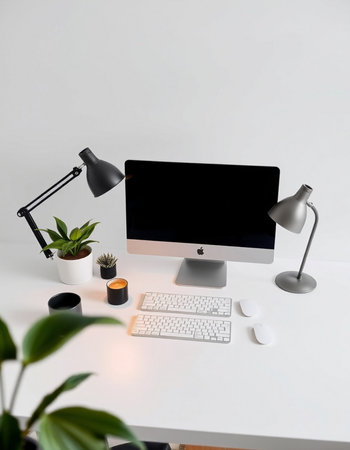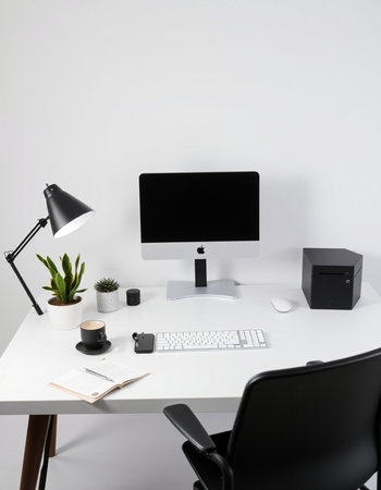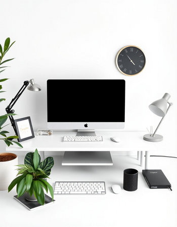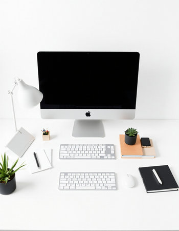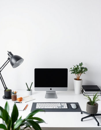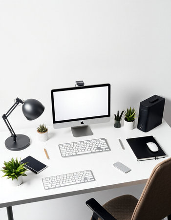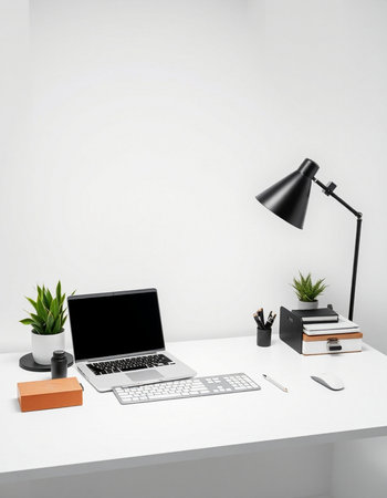 A laptop computer sits open on a bright white desk, accompanied by a keyboard, mouse, and a small potted plant. The setting is clean and minimalist, with neutral colors and soft lighting. This image could be used for various purposes, including website design, advertising, and marketing materials.