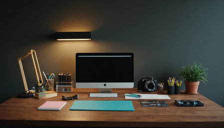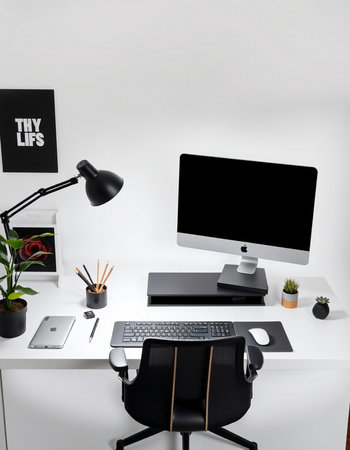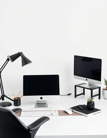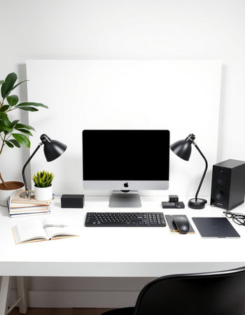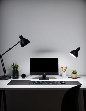 Modern workspace with computer, lamp and decorations. 3D Rendering