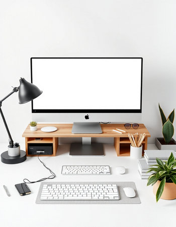Minimalistic workspace with blank screen computer, stationery and other items. 3D Rendering