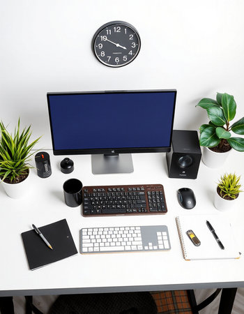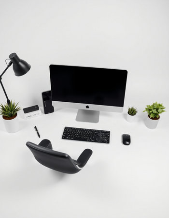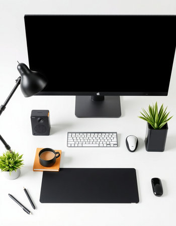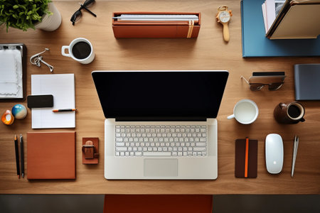 Efficient Workspace: A Top View of a Productive Desk with Computer and Office Supplies