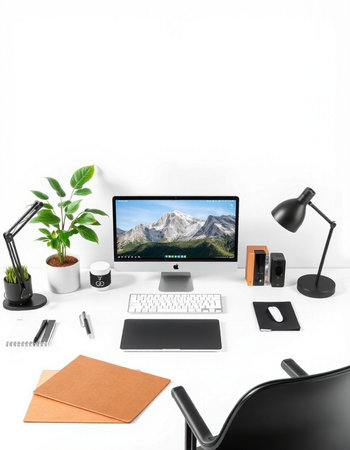 Modern workspace with computer, stationery, coffee cup and plant on white background