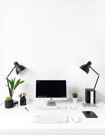 Workplace with computer, keyboard, mouse, lamp and plant on white wall background.
