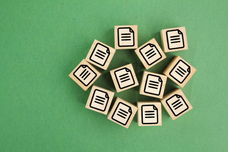 wooden square with document or file and folder icons. save the file to a folder. A Document Management System (DMS) is being prepared by an employed IT consultant