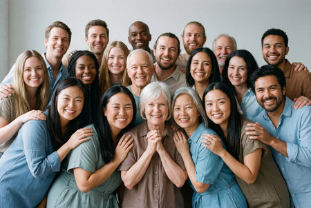 A group of people smiling for a photo. Scene is happy and friendly. The concept of the image is a diverse group of people coming together to share a moment of joy