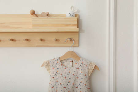 Wooden rack with cute dress in child room. Interior design