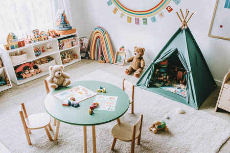 Bright and colorful children s playroom with pastel furniture and adorable decor elements