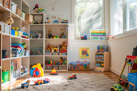 Well arranged child's playroom with toys, books, and a designated play area for organized fun