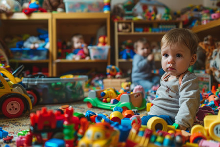 Cheerful toddlers surrounded by toys in cluttered room, with selective focus for a playful scene