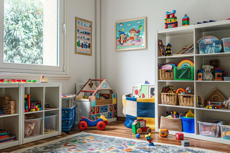 Organized and tidy childrens playroom with colorful toys, books, and an engaging play area for kids
