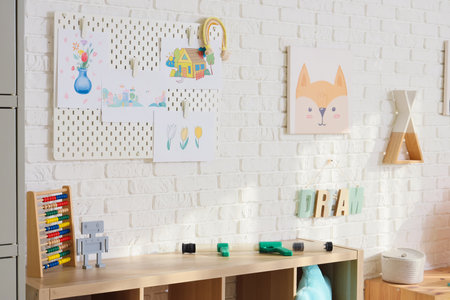Interior of playroom with pegboard and pictures in kindergarten