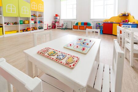Arkhangelsk, Russia - march 3, 2018: Desk for lessons with toys in bright white game room in the kindergarten. Closeup.