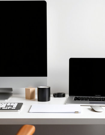 Modern workspace with computer, laptop, smartphone and stationery on white table