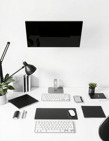 Minimalistic workplace with computer, mouse, keyboard and other items on white table. Mock up, 3D Rendering